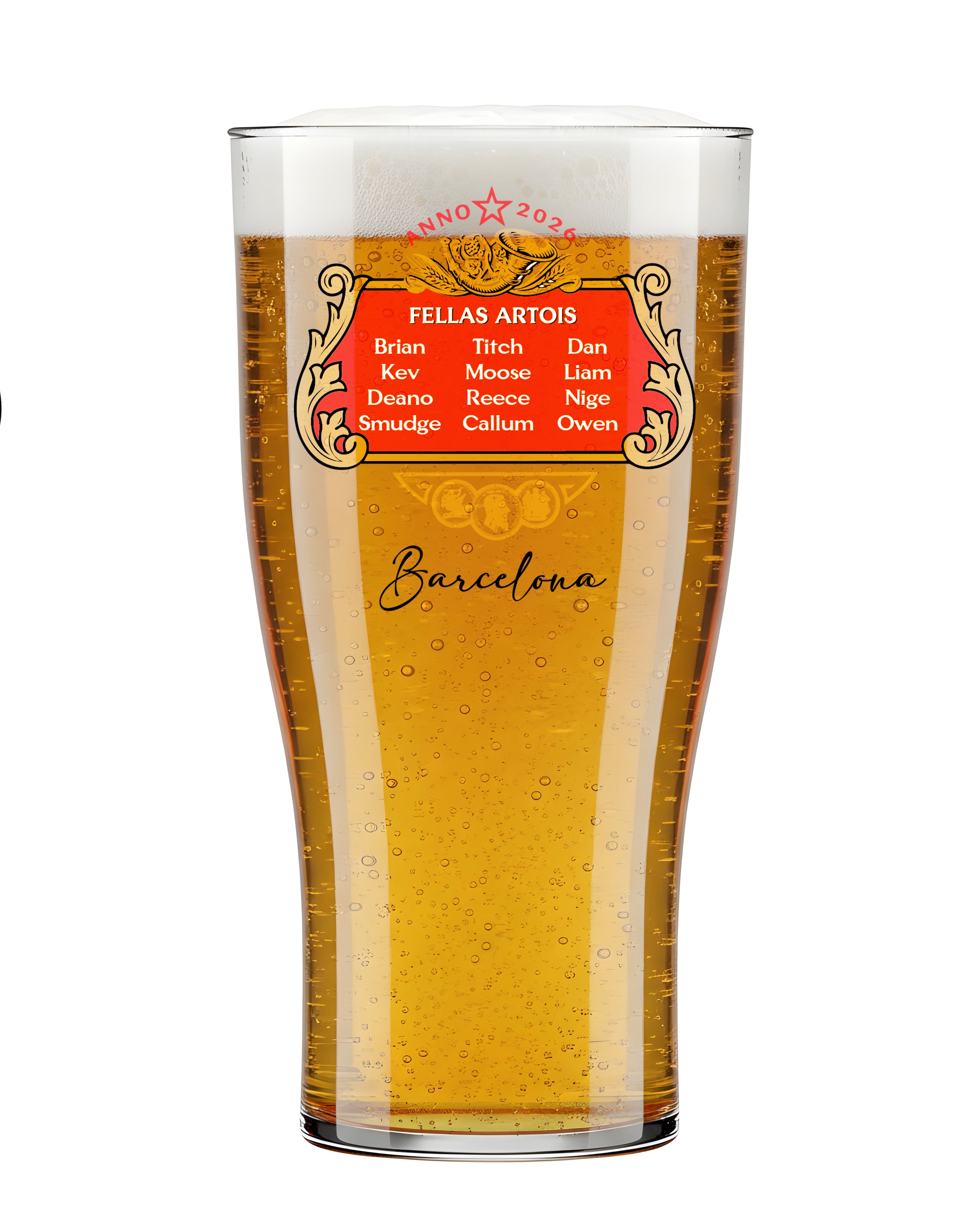 Back: “Fellas Artois” list (with tiny star icons).