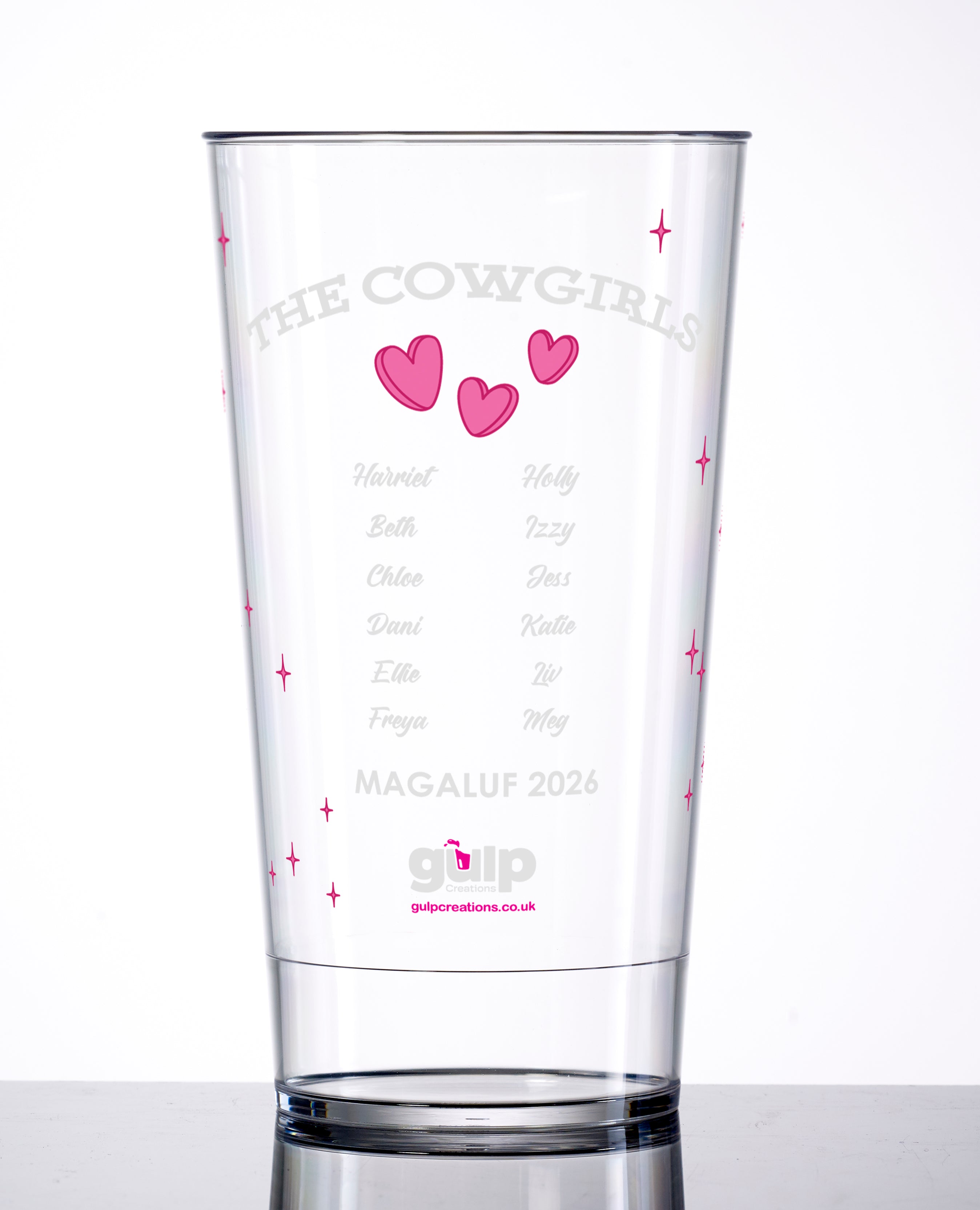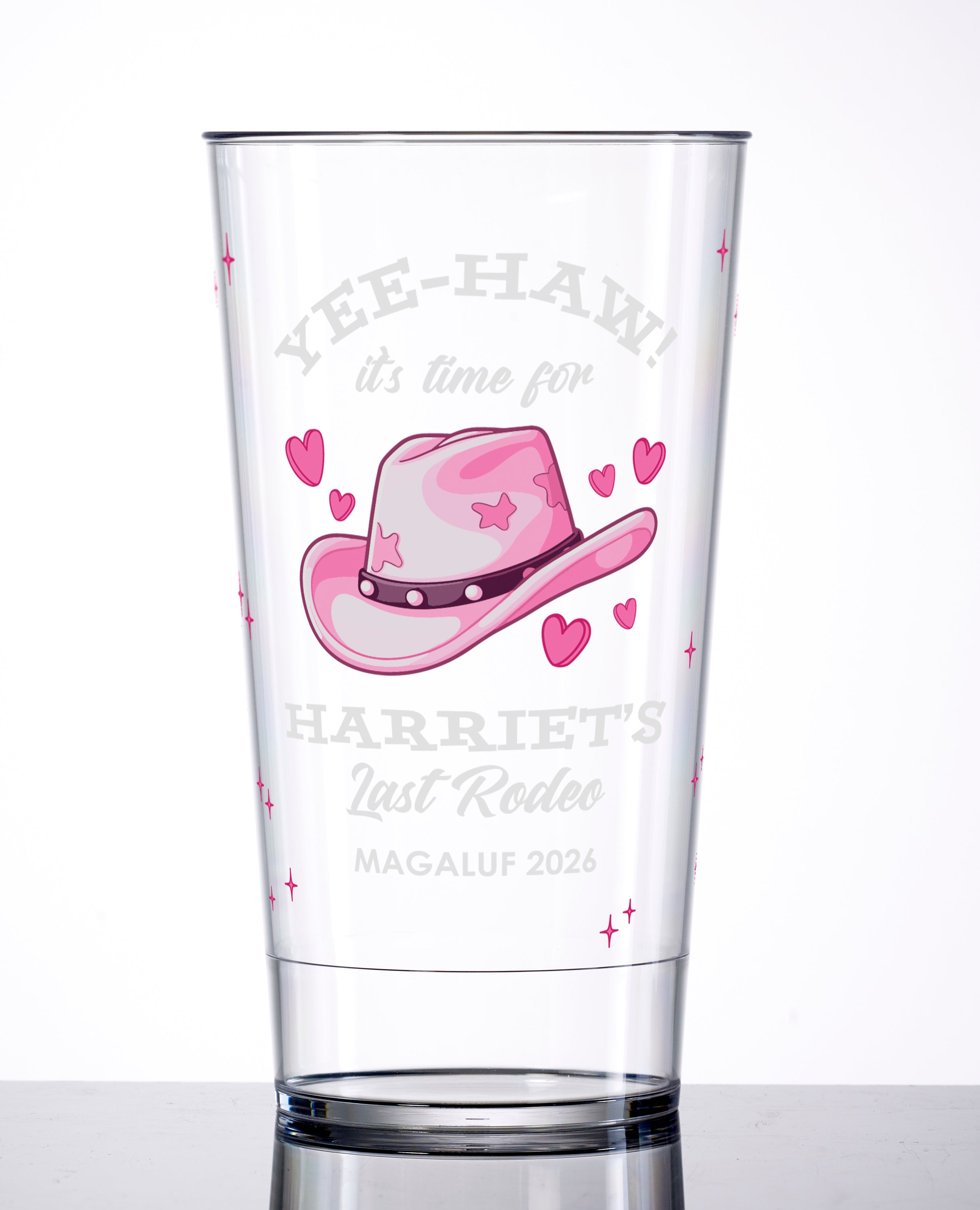 Saddle up. This cowgirl-themed pint cup turns your hen into the headline act - badge on the front, squad on the back, and enough rodeo flair to last all night. 18+ only.